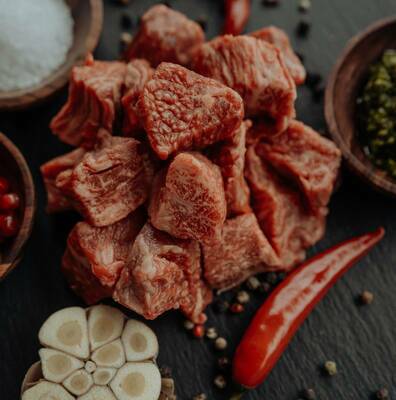 Das Gulasch stammt überwiegend aus der Keule und hat viel Marmorierung. Es ist sehr zart, geschmackvoll und saftig.